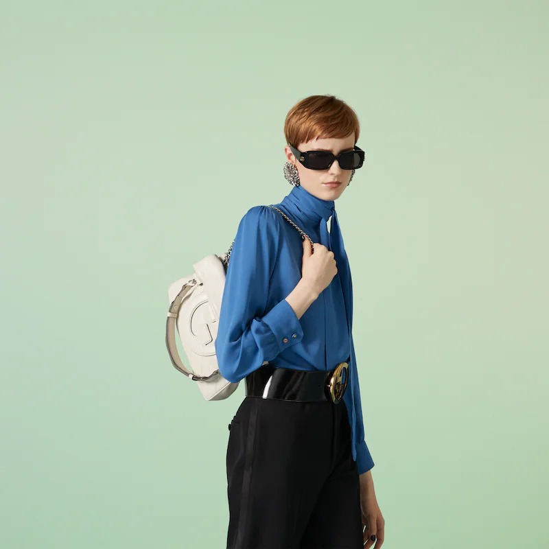 The Round Interlocking G that characterizes the Gucci Blondie line originates from the House archives. Signature pieces such as this Gucci Blondie tote bag with a top handle and chain shoulder strap reinterprets the emblem as a subtler leather patch detail.